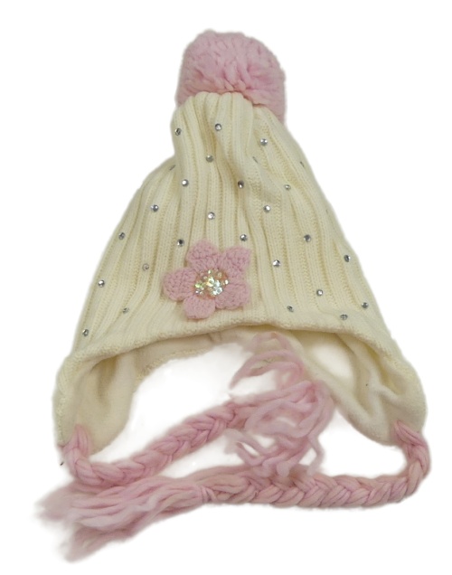 Bielo-ružová čapica s kamienkami a 3D květem a brmbolcom