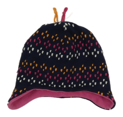 Tmavomodro-farebná vzorovaná čapica s strapcemi