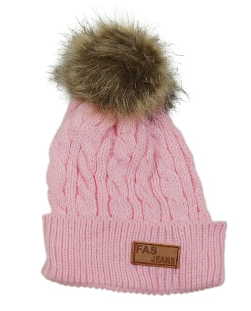 Svetloružová vzorovaná pletená čapica s nášivkou a brmbolcom