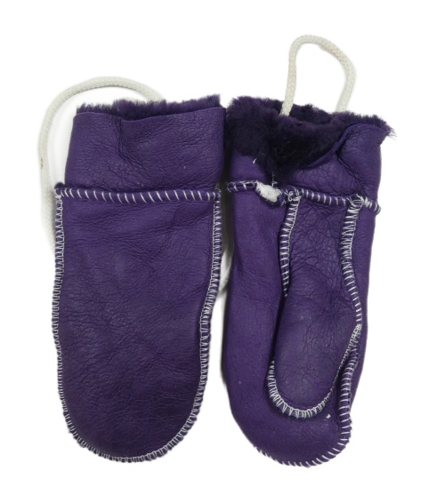 Tmavofialové semišové zateplené palcové rukavice s kožešinou a šňůrkou