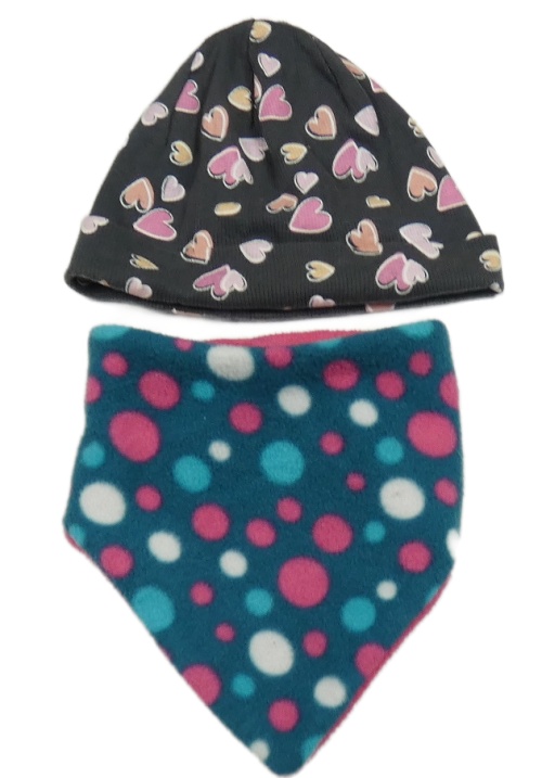 2set - Antracitová rebrovaná čapica so srdíčky + petrolejový puntíkatý fleecový šátek