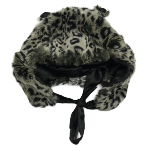 Sivo-béžovo-čierna kožušinová čapica s leopardím vzorom