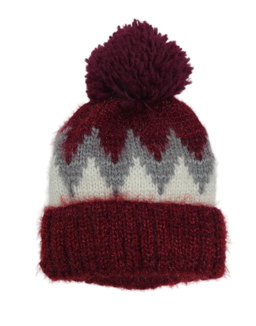 Červeno-bielo-sivá pletená zateplená čapica s brmbolcom