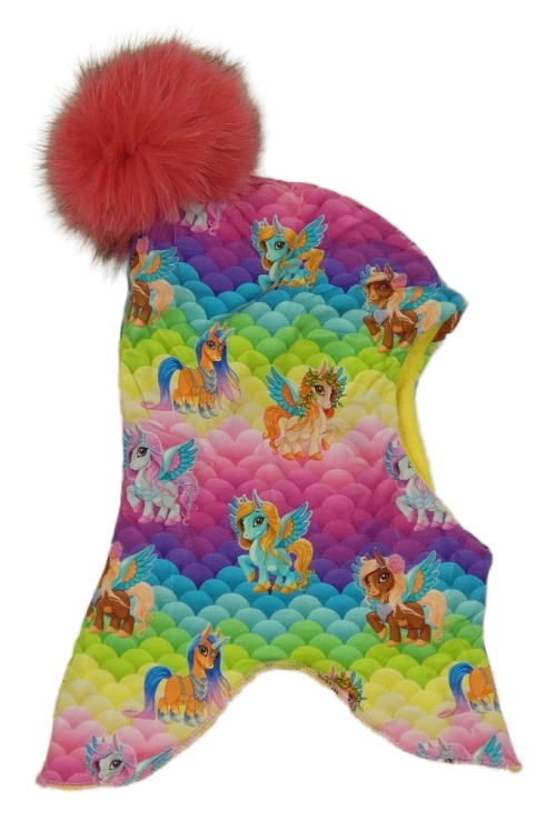 Barevná vzorovaná kukla s jednorožcami a brmbolcom