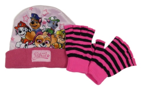 2 set - Svetloružová pletená/sametová čapica s Tlapkovou patrolou + černo-růžové pruhované bezprstové rukavice