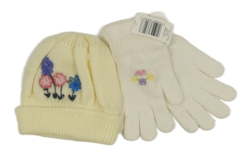 Nové - 2 set - smotanová pletená čapica s květinami + bílé pletené prstové rukavice Ladybird