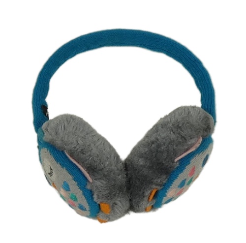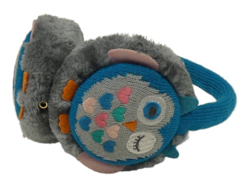 Šedo-azurová chlupato/pletené klapky na uši so sovami
