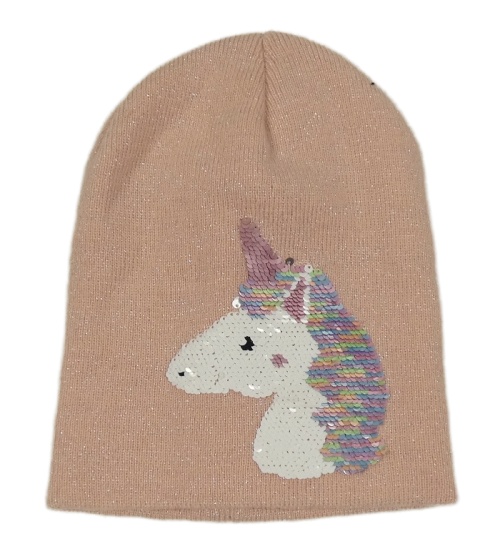 Svetloružová -strieborná pletená čapica s jednorožcem z flitrů