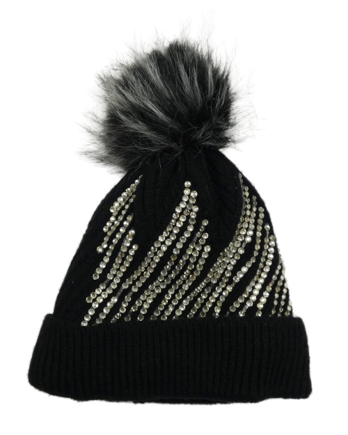 Čierna pletená zateplená čapica s kamienkami a brmbolcom