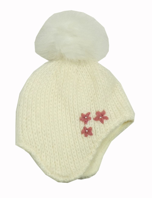 Smotanová pletená čapica s kvetmi a brmbolcom Pusblu