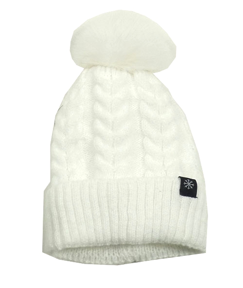Biela pletená čapica s nášivkou a brmbolcom