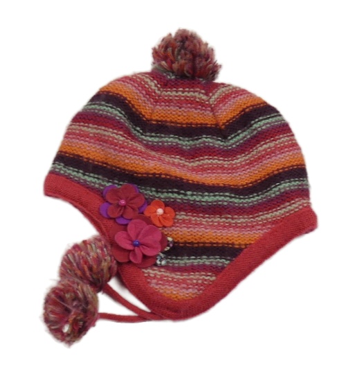 Ružovo-hnedo-zelená pruhovaná čapica s kvietkami a strapcemi