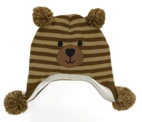 Béžovo-hnedá pruhovaná čapica s ňufáčikom a bambulemi