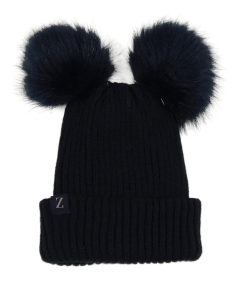 Tmavomodrá rebrovaná čapica s nášivkou a bambulemi