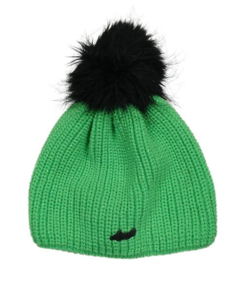 Neónově zelená trblietavá čapica s nášivkou a brmbolcom