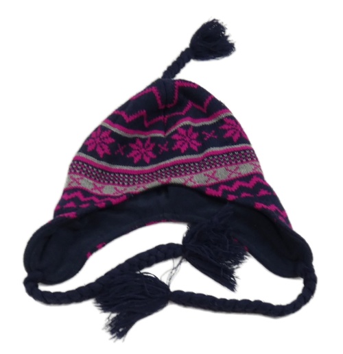 Tmavomodro-fuchsiovo-sivá vzorovaná čapica s strapcemi