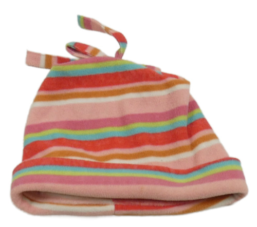 Modro-ružovo-biela pruhovaná fleecová čapica s strapcemi