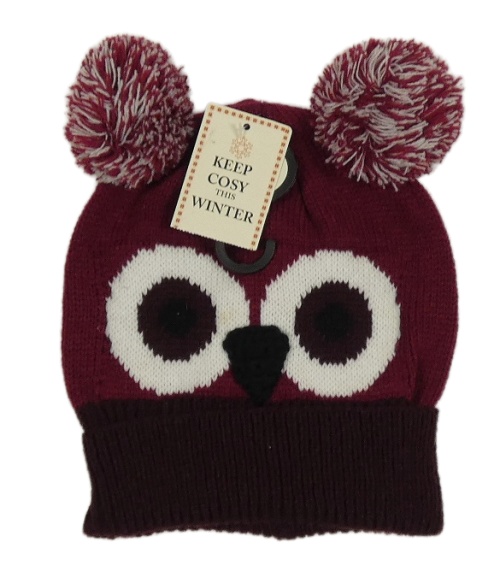 Nové - Vínová pletená čapica s očima a bambulemi