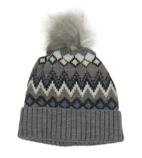 Sivo-modro-biela vzorovaná trblietavá pletená čapica s brmbolcom