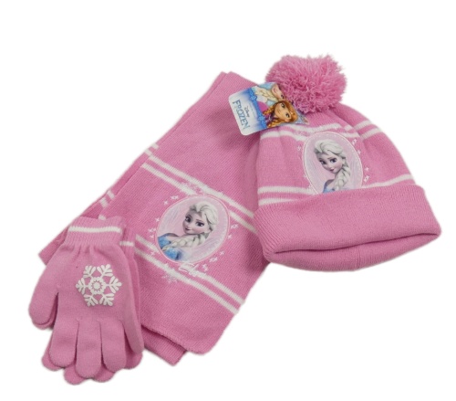 Nové - 3Set - Ružová pletená čapica s Elsou a bílými pruhy + bambulí + šála + prstové rukavice Disney