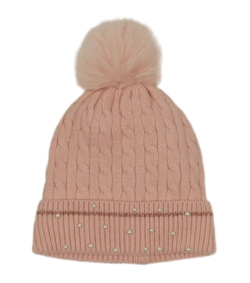 Svetloružová vzorovaná pletená podšitá čapica s korálkami