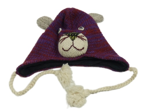 Fialovo-mahagónovoá pruhovaná vlnená podšitá čapica s čumákem - medvěď