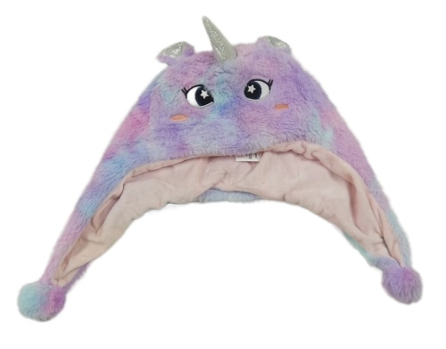 Fialovo-modrá kožušinová čapica s bambulemi a čumákem - jednorožec