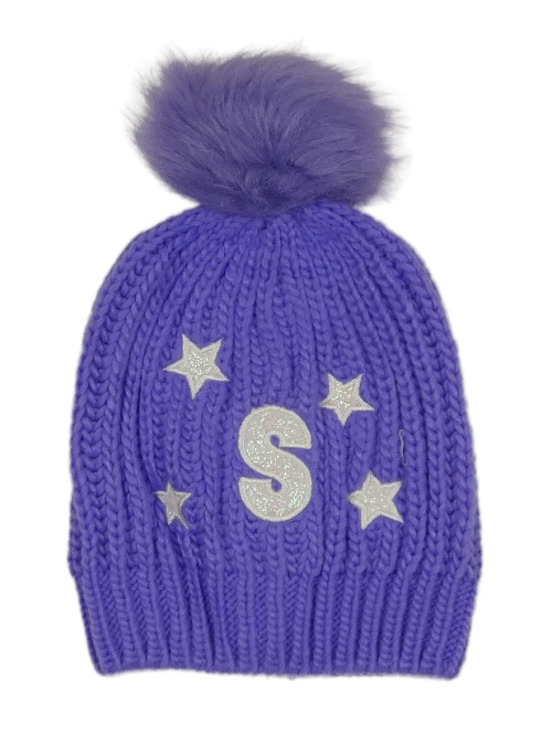 Fialová rebrovaná pletená čapica s písmenkom a hviezdičkami a brmbolcom