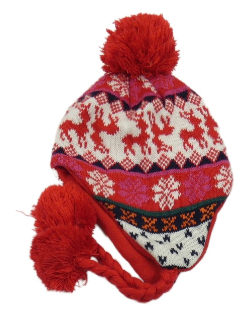 Červeno-ružovo-biela vzorovaná čapica s strapcemi a brmbolcom