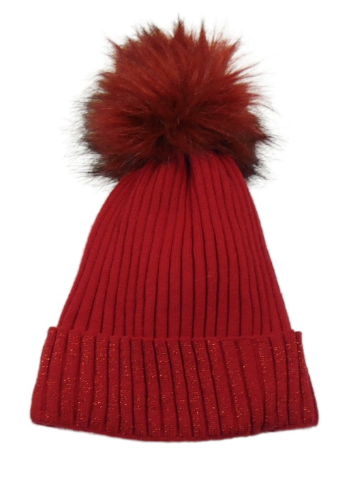 Červená rebrovaná pletená čapica so trblietkami a brmbolcom