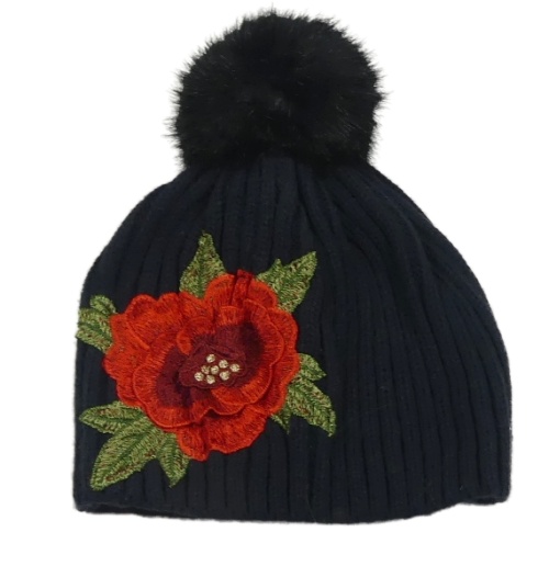 Tmavomodrá rebrovaná pletená čapica s květem a brmbolcom LAURA ASHLEY