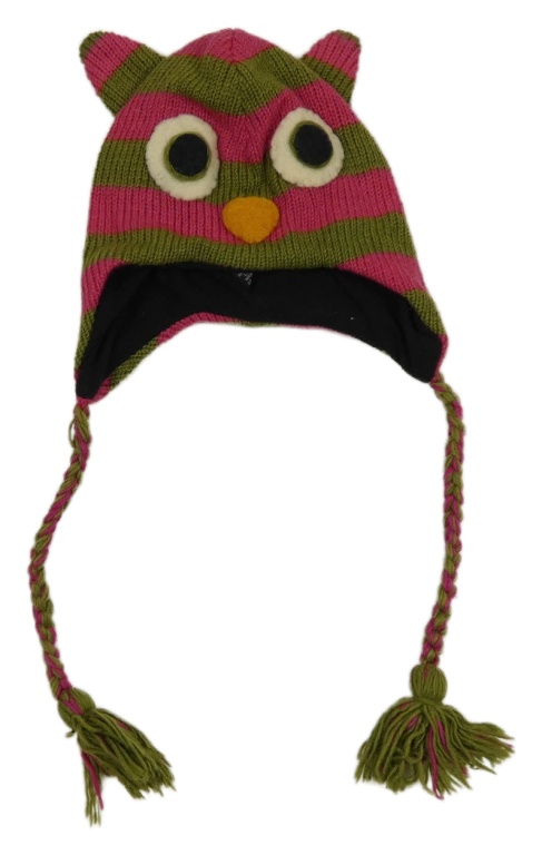 Zeleno-růžová pruhovaná vlněná čepice - sova
