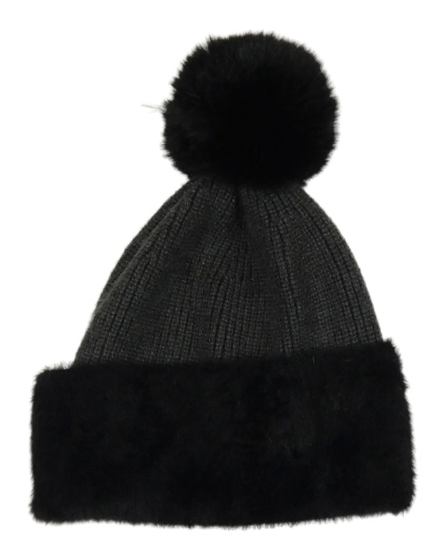 Sivo-čierna melírovaná rebrovaná pleteno/kožešinová čapica s brmbolcom