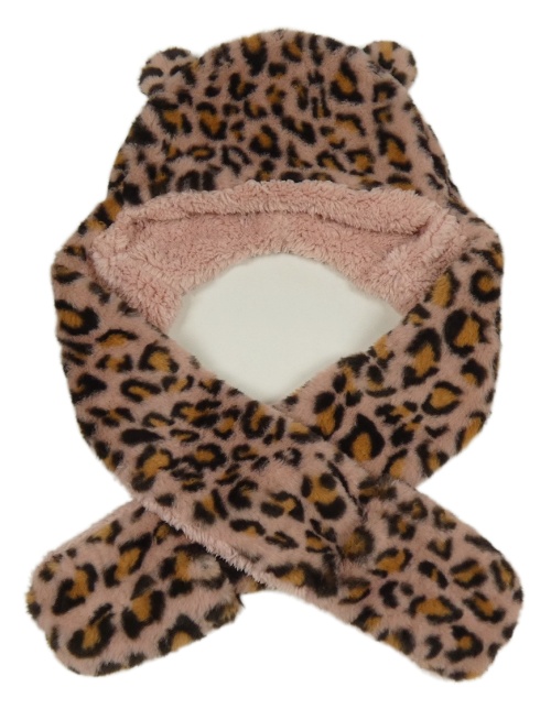 Ružovo-béžovo-hnedá vzorovaná kožušinová čapica so šálou