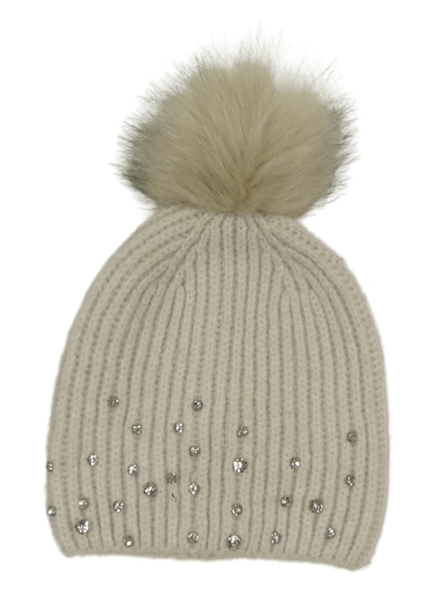 Smotanová rebrovaná pletená čapica s kamienkami a brmbolcom Tu
