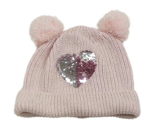 Svetloružová trblietavá pletená čapica so srdiečkom a bambulkami