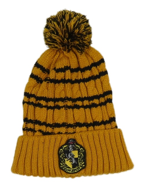 Hořčicovo-čierna pruhovaná čapica s nášivkou a bambulí - Harry Potter