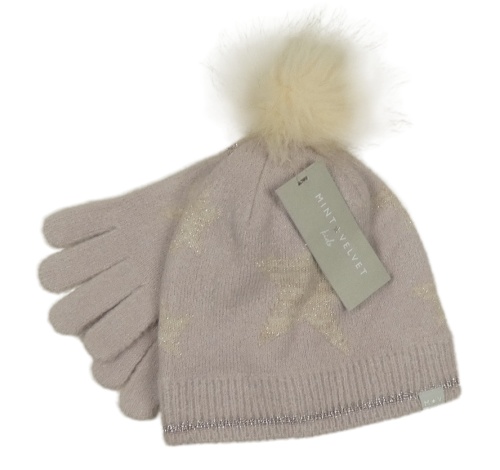 Nové - 2 set - lila pletená čapica s hviezdou a bambulí + pletené prstové rukavice