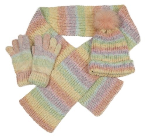 3set - Farebná pruhovaná čapica s bambulí + šála + rukavice Next