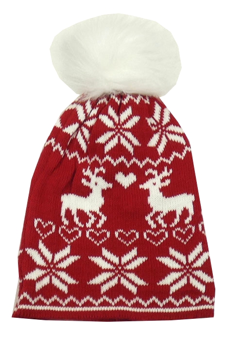 Červená vzorovaná pletená čapica so sobmi a brmbolcom