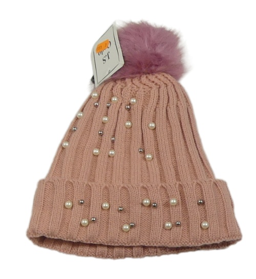 Nové - Staroružová rebrovaná pletená čapica s perlami a brmbolcom