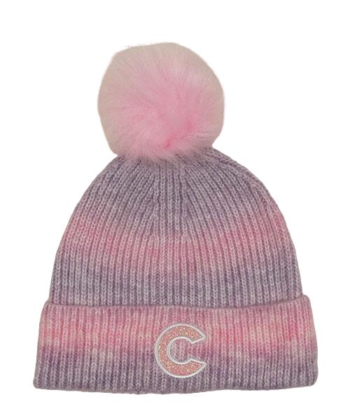 Lila-ružová pletená čapica s písmenem a brmbolcom