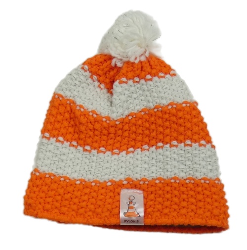 Oranžovo-biela pruhovaná pletená čapica s brmbolcom