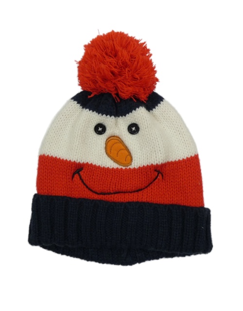 Tmavomodro-červeno-biela pruhovaná pletená čapica so sněhulákem