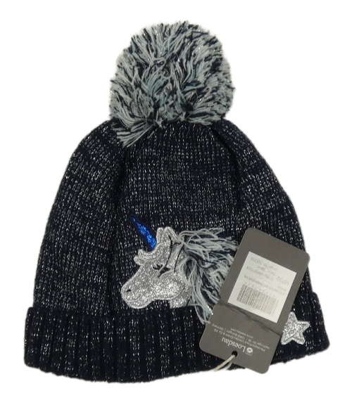 Nové - Tmavomodrá trblietavá pletená čapica s jednorožcom a brmbolcom
