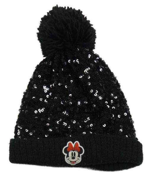 Čierna tylovo/pletená čapica s Minnie a flitrami a brmbolcom Disney