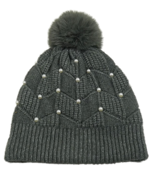 Tmavosivá pletená čapica s perličkami a brmbolcom
