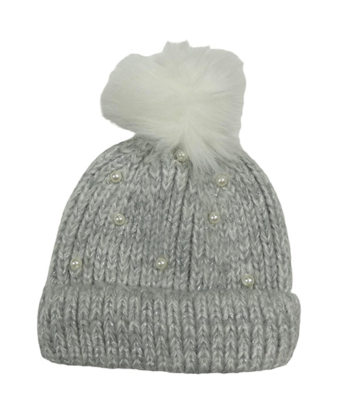 Sivá melírovaná trblietavá pletená čapica s perlami a brmbolcom Tu