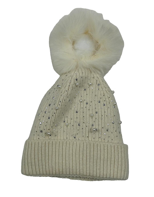 Béžová pletená čapica s kamienky s perlami a brmbolcom
