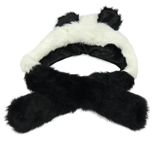 Bielo-čierna kožušinová čapica s uškami a šálou - panda